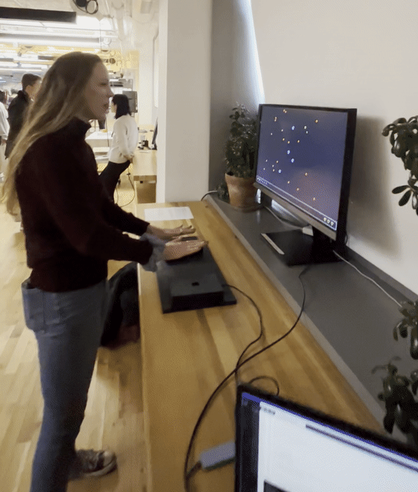 The game uses two distance sensors enclosed in the black console in front of the monitor to control movement on screen. When players move their hands up and down, that data is sent through serial communication from the Arduino IDE serial monitor to a game made in p5.js.