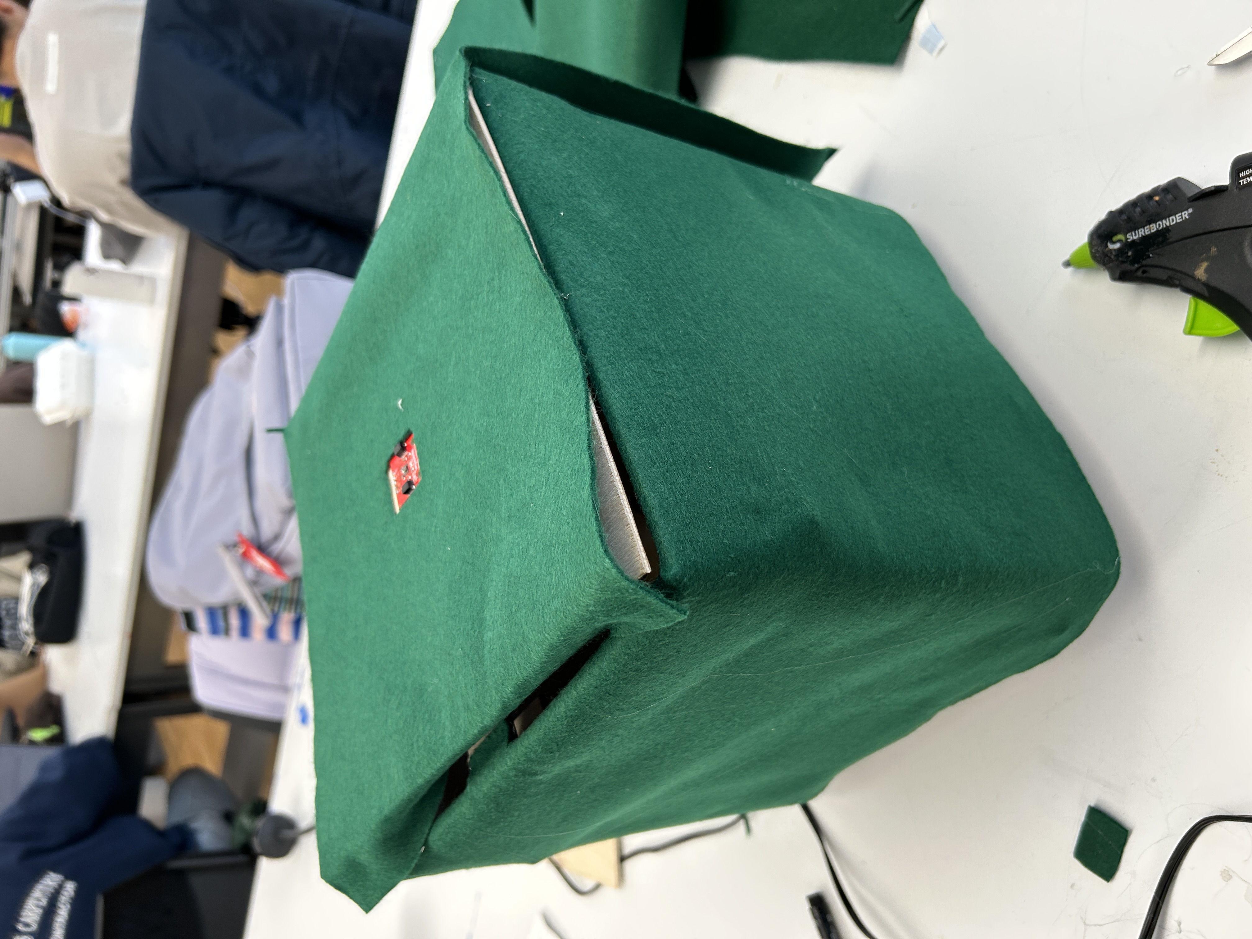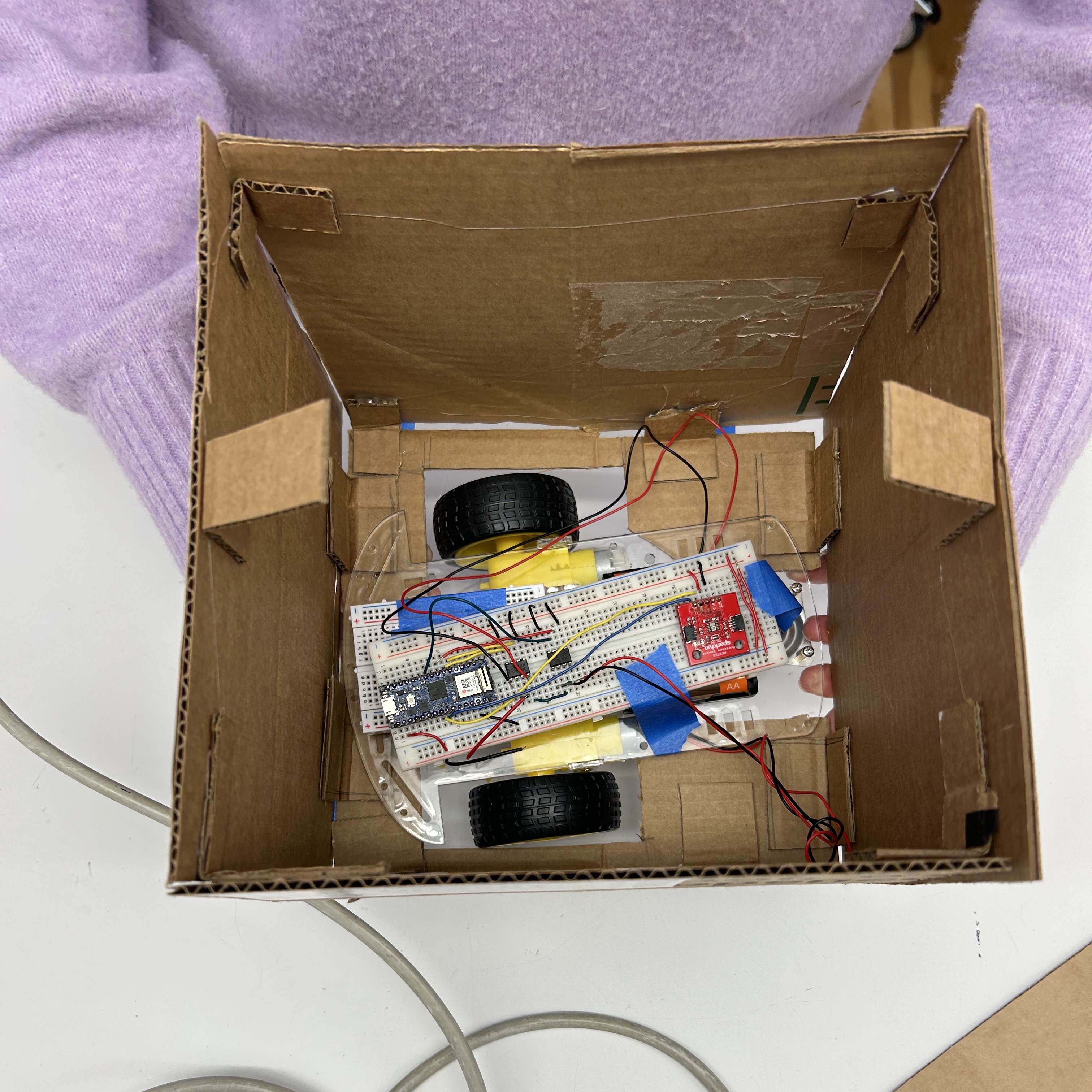 Next, we got started on fabrication. We lasercut a prototype in cardboard first and tested it out on the floor. It worked, but the movement was a little chaotic. We found that the sound of the motors, coupled with their intensity, did not have the calm, sleepy vibe we were going for. Also, we were running out of time and didn’t see a world in which we’d figure out the speaker & LEDs we had envisioned in time. We decided to rebrand from Sleepy Cube to Catch Me If You Can Cube.