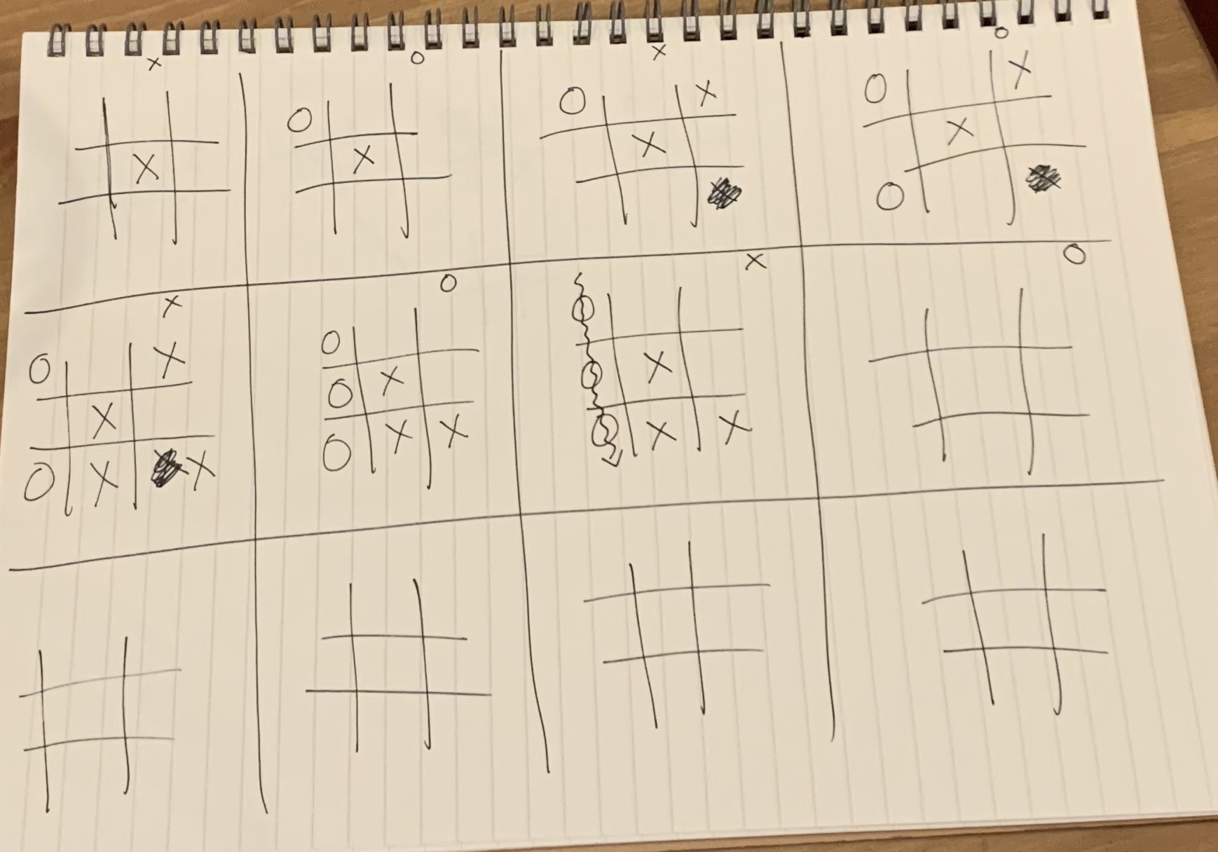 For Tic Tac Toe, we used cut-up pieces of construction paper and taped them to the table, and positioned my phone camera above on a mounted tripod. It was difficult at first to get an angle that didn’t show any shadows. This video is made up of 45 frames in total.