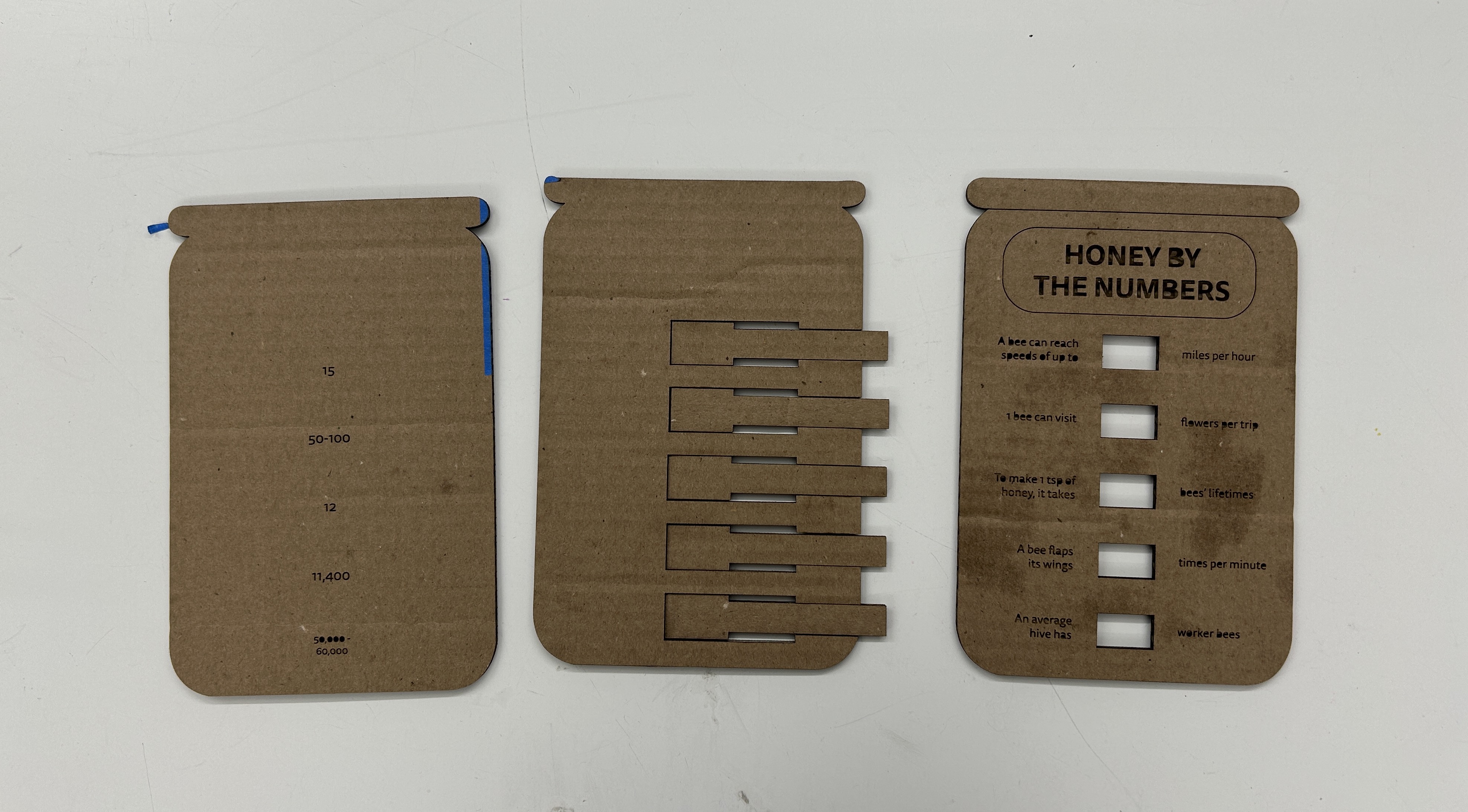 For my curiosity portal, I wanted to create something that would live at the farmers market where I work, selling honey for a farm in upstate New York. I get a lot of questions from customers about how the honey is made, how many bees are at the farm, and how long it takes to make the honey. I created Honey by the Numbers to answer some of these questions. I also wanted it to act as a way for people to reflect on how much work goes into getting this jar of honey all the way from the flowers to the market in Downtown Brooklyn. I did some research and learned some really interesting facts, and then had the idea to create a toy that invited people to guess the missing number, and then pull a tab to learn the answer.