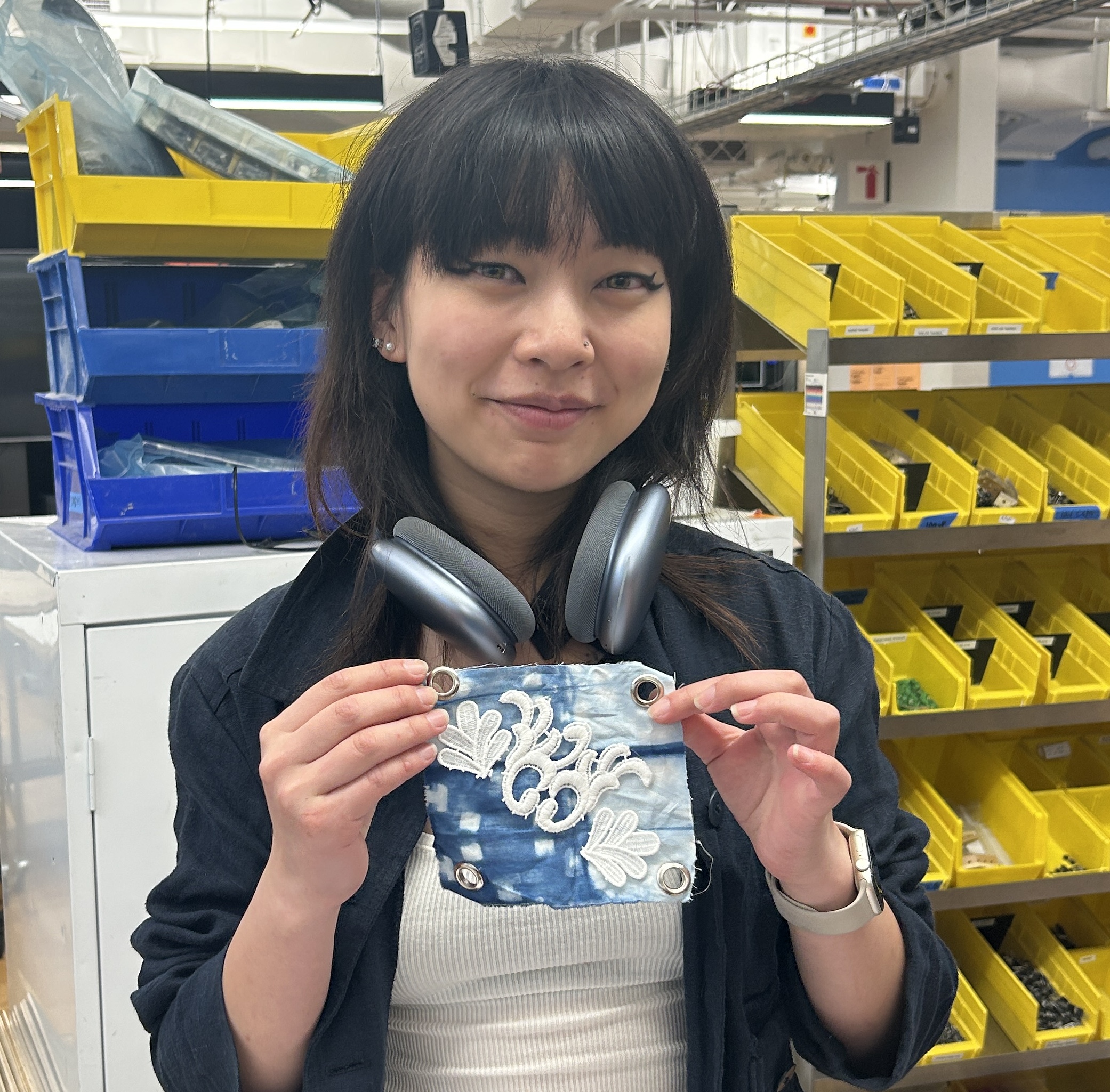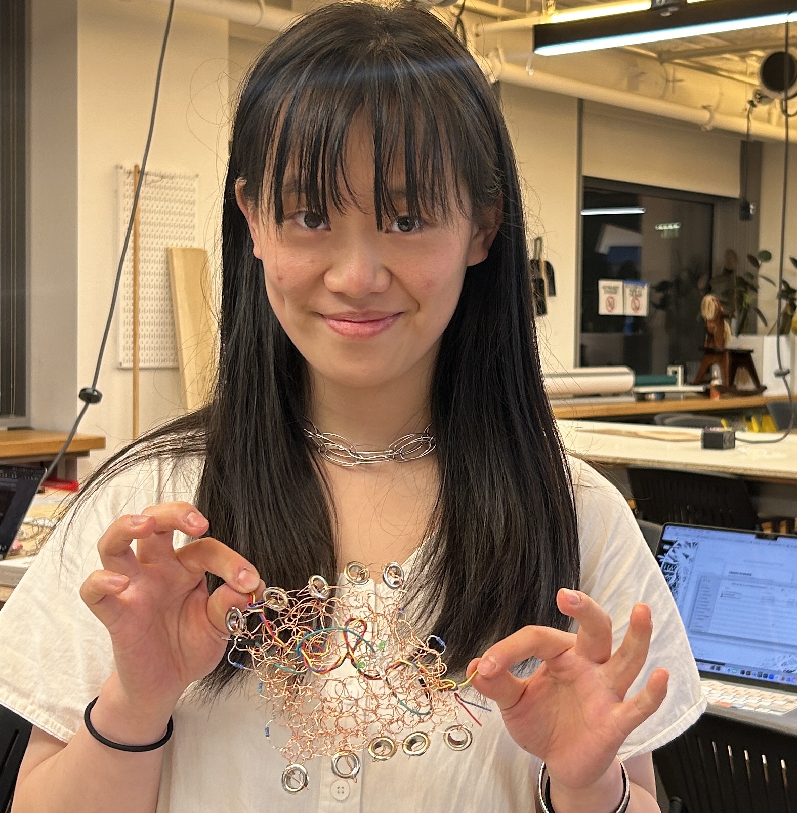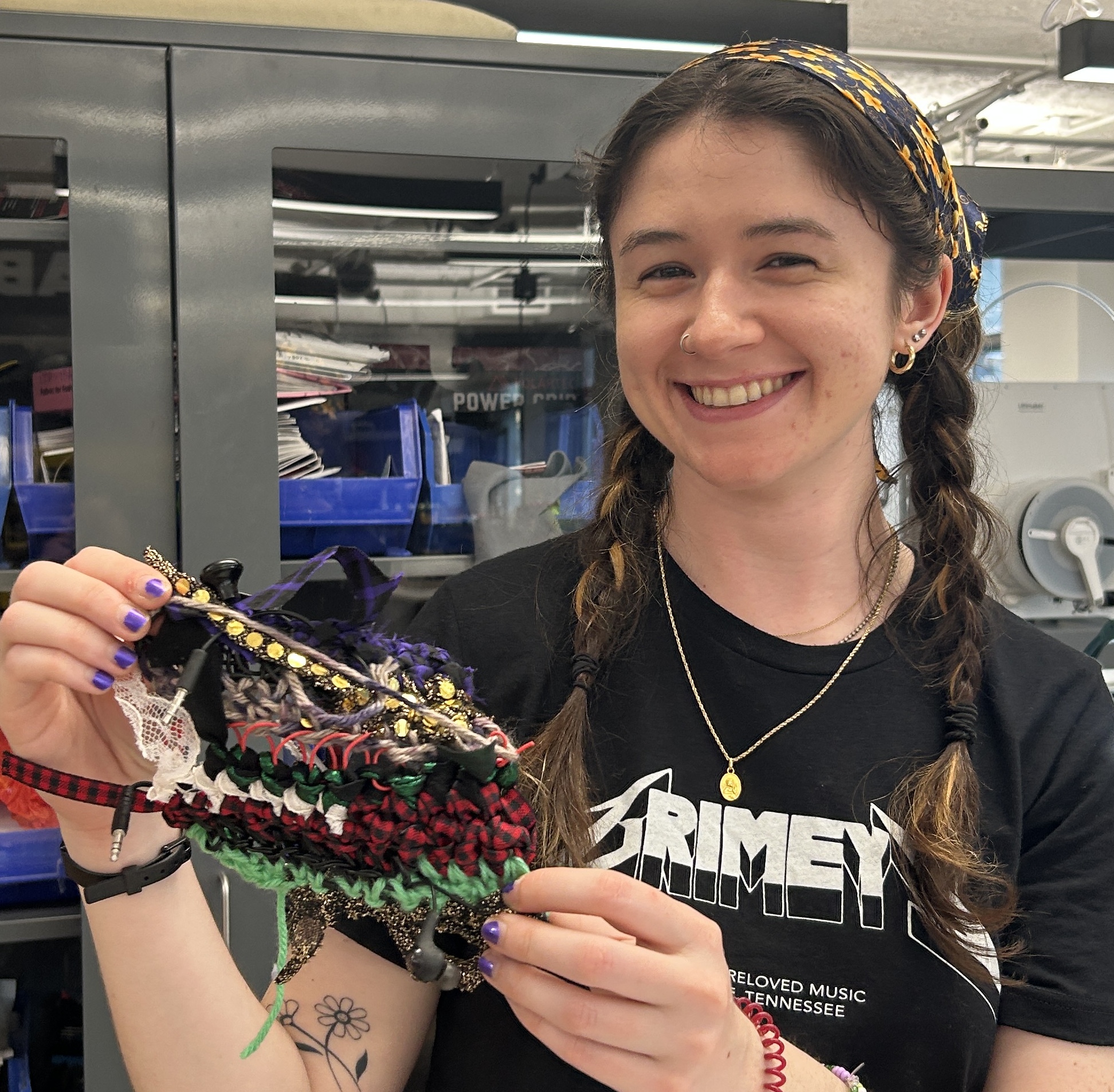 felt, pom poms, plywood, lace, yarn, cardboard, mesh, acrylic, metal jump rings, copper wire, grommets, foam sheets, embroidery thread, wire headphones, fabrics, markers, pencils, pens, sequins, ribbon, pony beads, plastic bags, discarded 3D print pieces, feathers, rubber, wire, 1 sock, 1 speaker, and 1 broken Arduino ethernet shield.After all of of the squares were done, I added grommets to the corners of each one and then joined them together using wire, ribbon, and yarn.