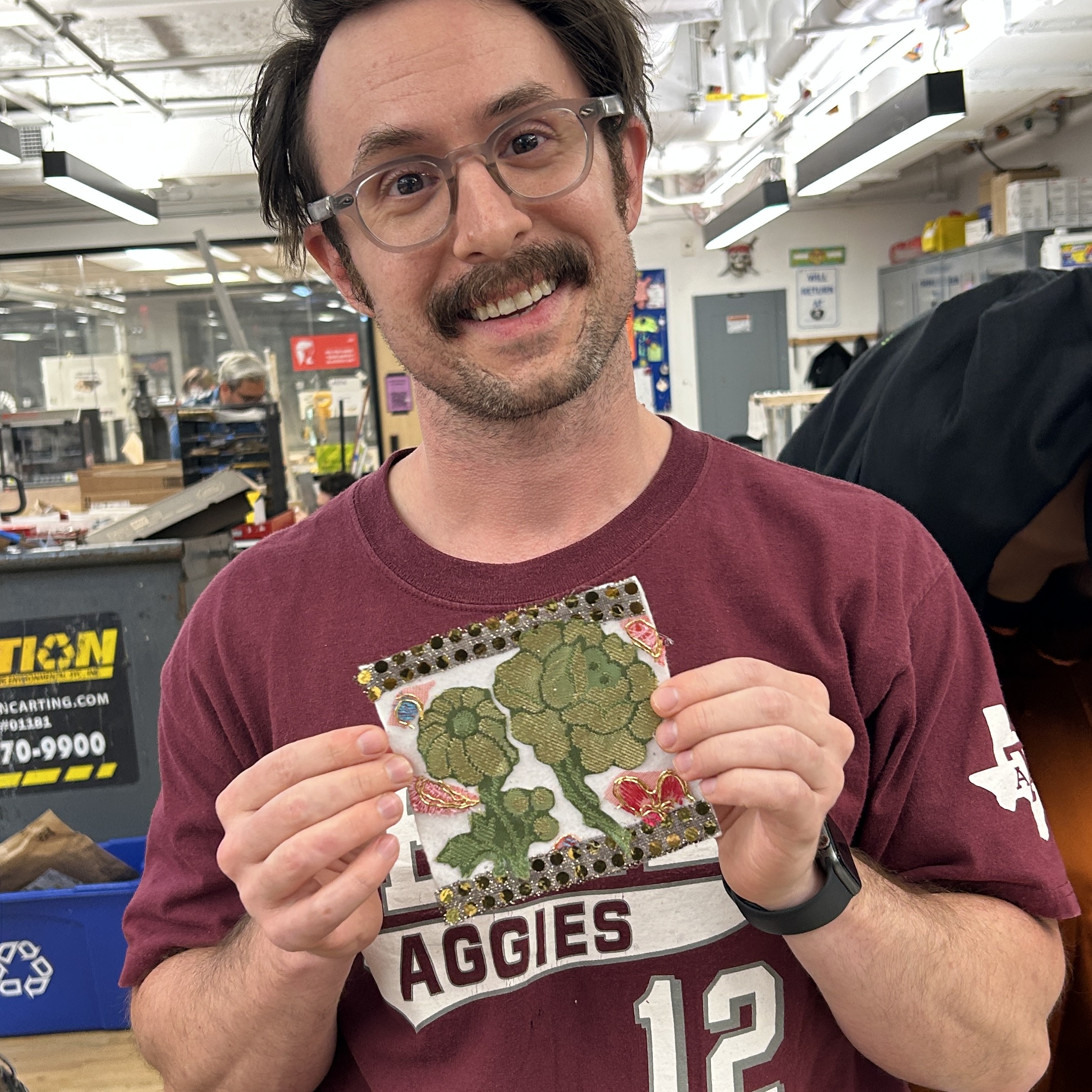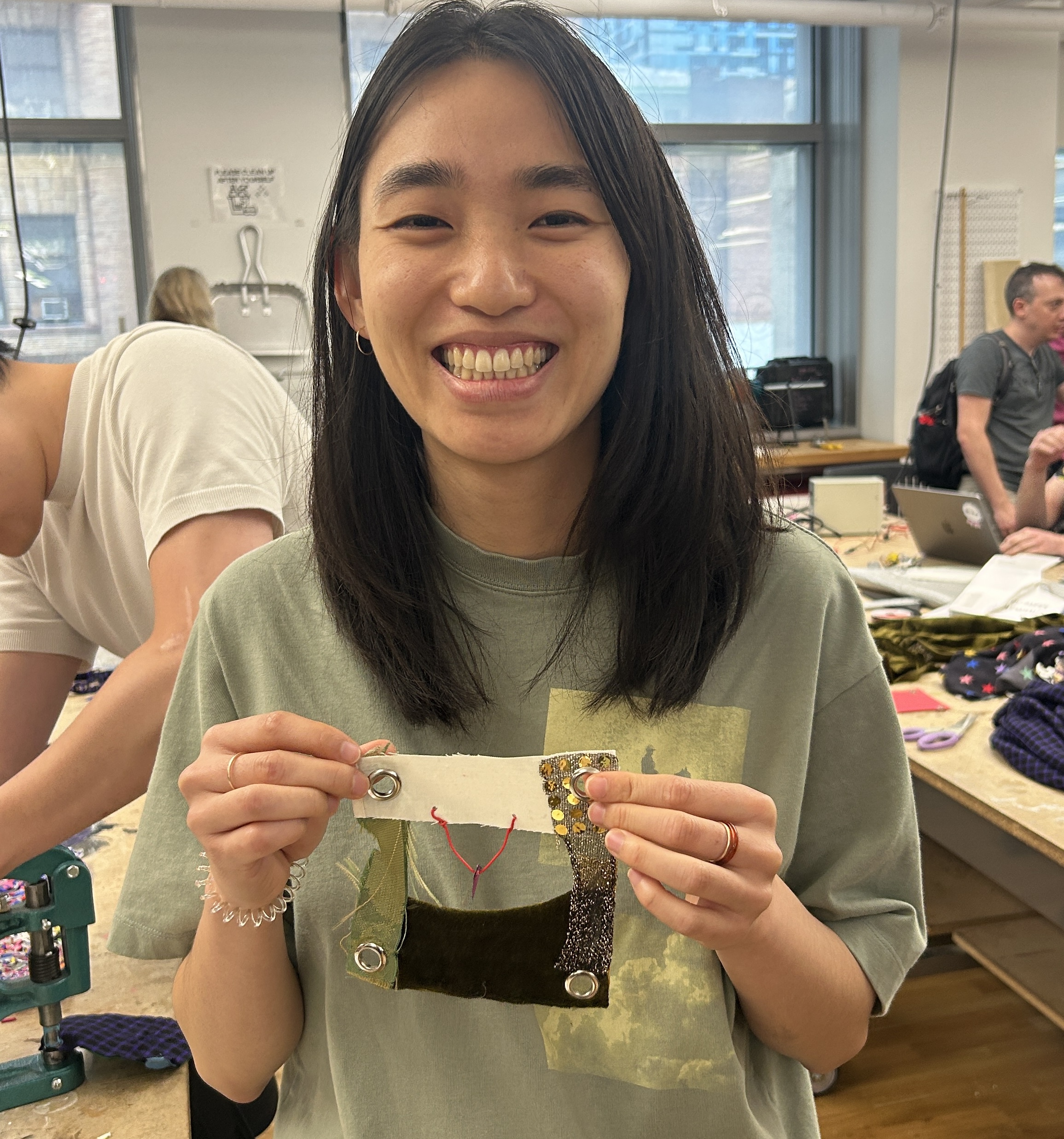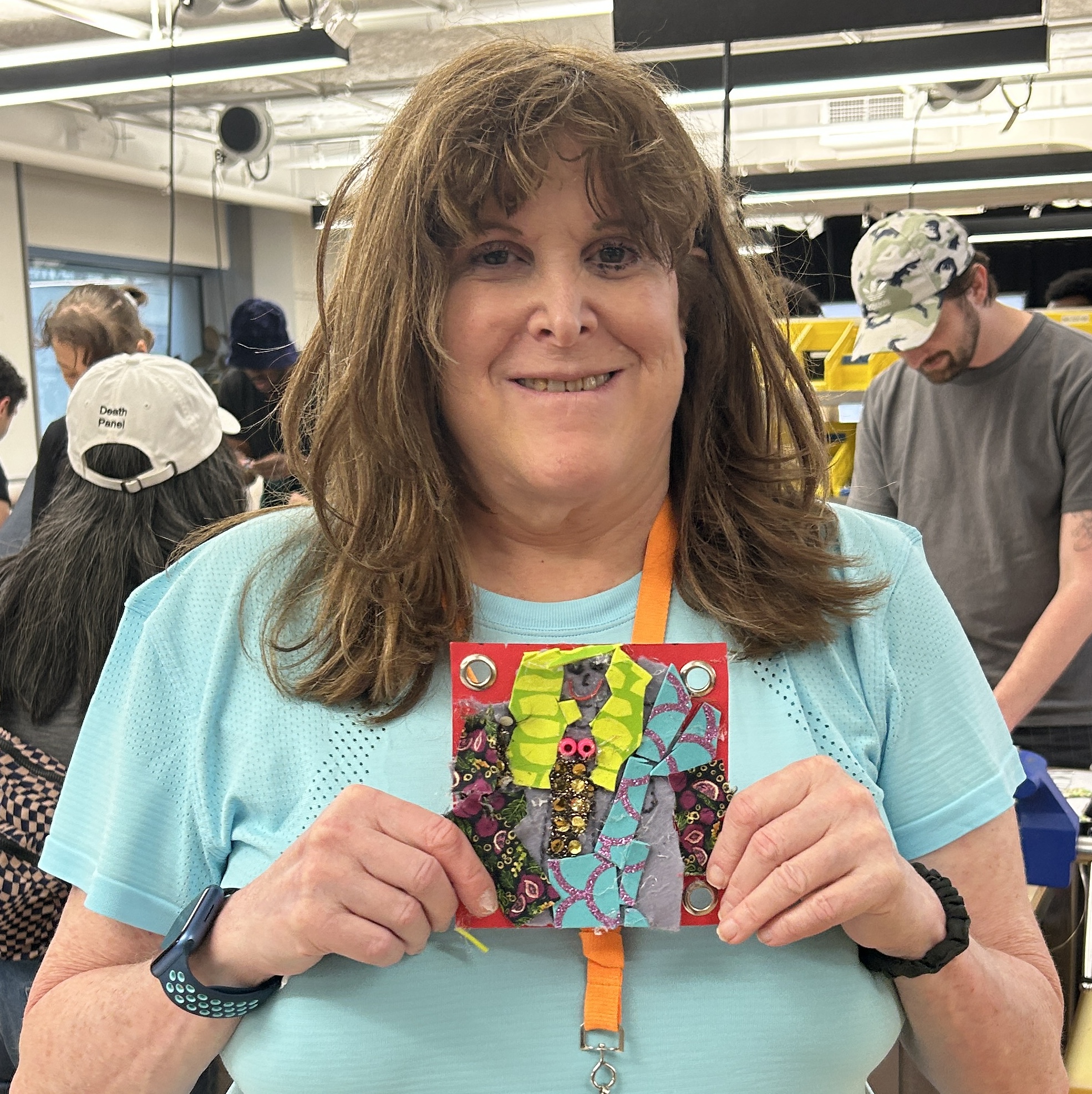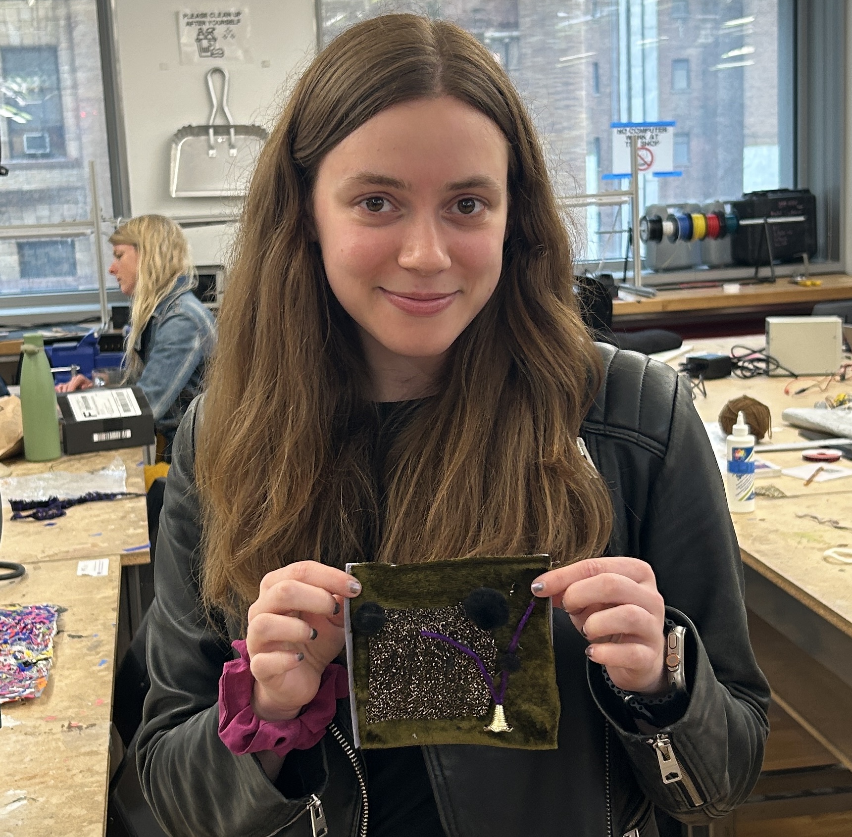 felt, pom poms, plywood, lace, yarn, cardboard, mesh, acrylic, metal jump rings, copper wire, grommets, foam sheets, embroidery thread, wire headphones, fabrics, markers, pencils, pens, sequins, ribbon, pony beads, plastic bags, discarded 3D print pieces, feathers, rubber, wire, 1 sock, 1 speaker, and 1 broken Arduino ethernet shield.After all of of the squares were done, I added grommets to the corners of each one and then joined them together using wire, ribbon, and yarn.