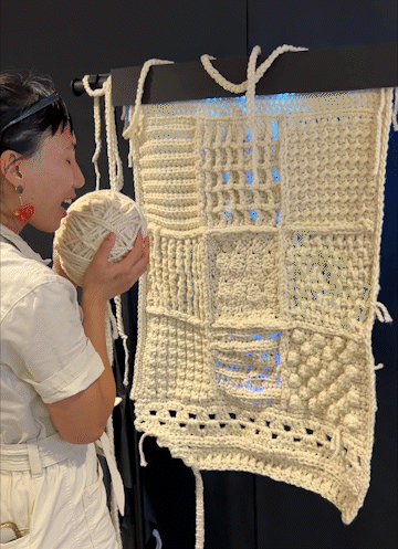 Inspired by practices of using textiles to record stories and events, Storied Blanket is an ever-changing light installation that reflects the sonic atmosphere of the room it is in through changes in brightness and color of the lights woven through it.Participants are invited to observe a visual representation of the room that Storied Blanket is installed in, as well as change it themselves by speaking into the ball of yarn. Storied Blanket was designed to look unfinished; it relies on the sound of the room and participants to add color to it to finish it.