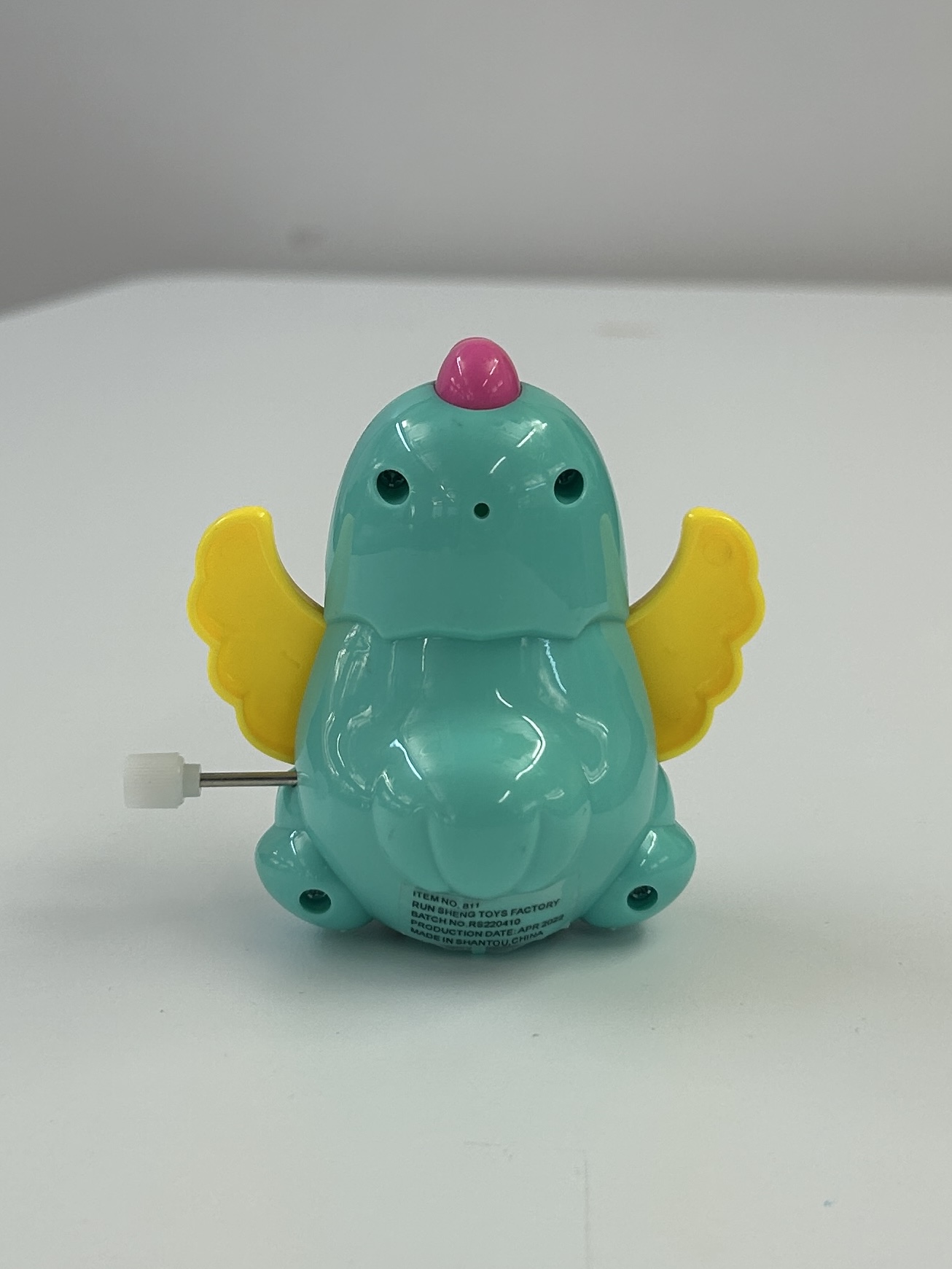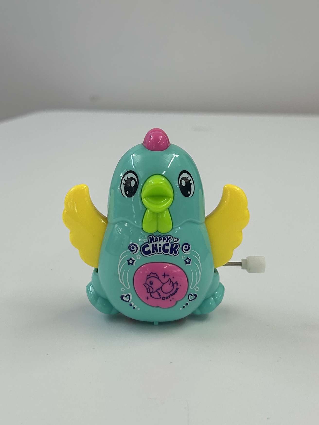 My toy is a plastic chicken that, when wound up, moves forward and flaps its wings.
