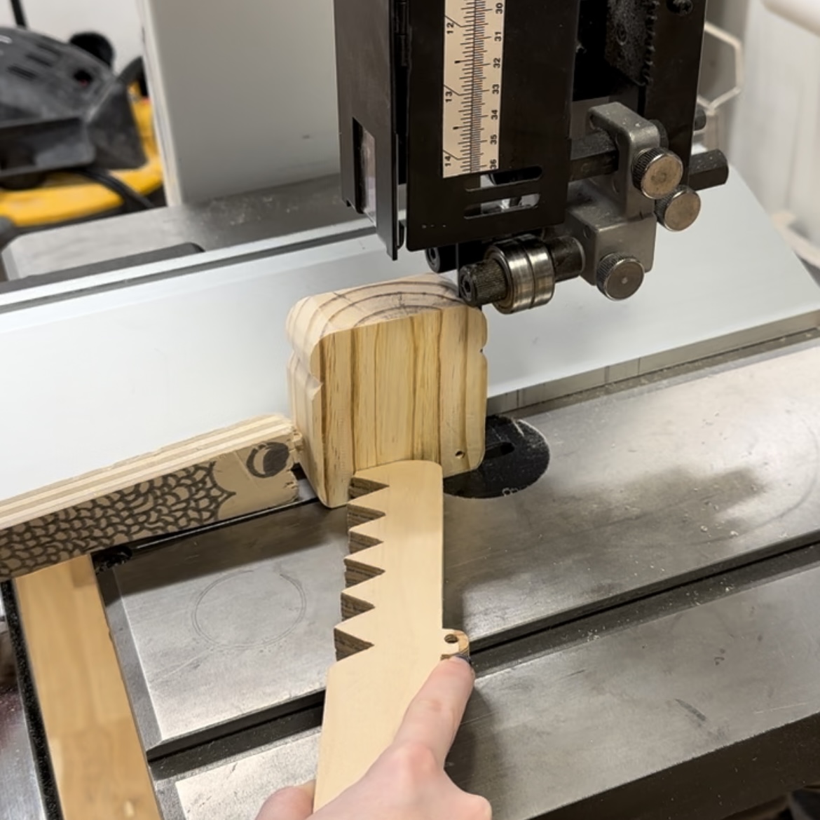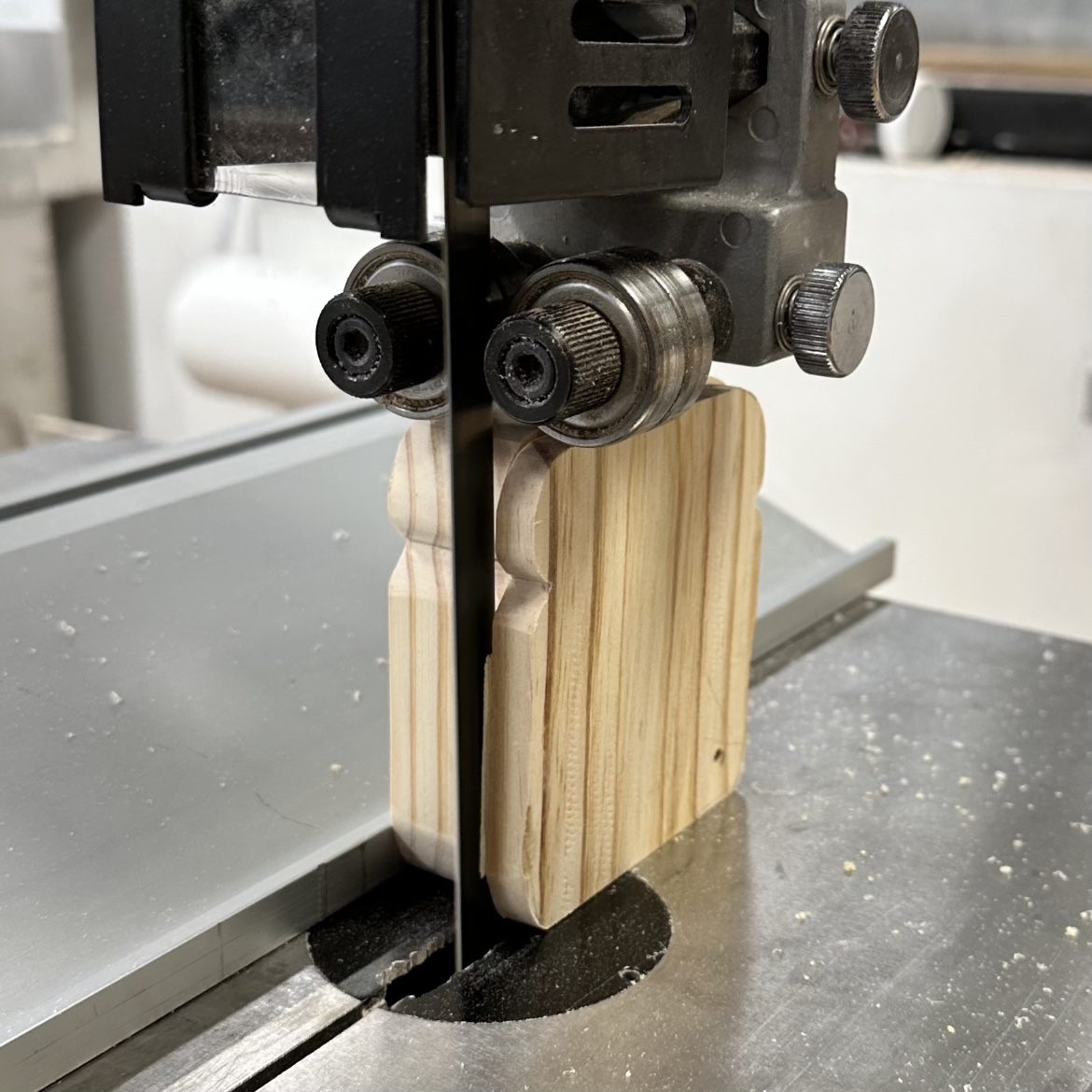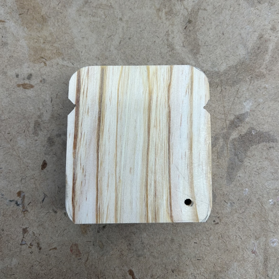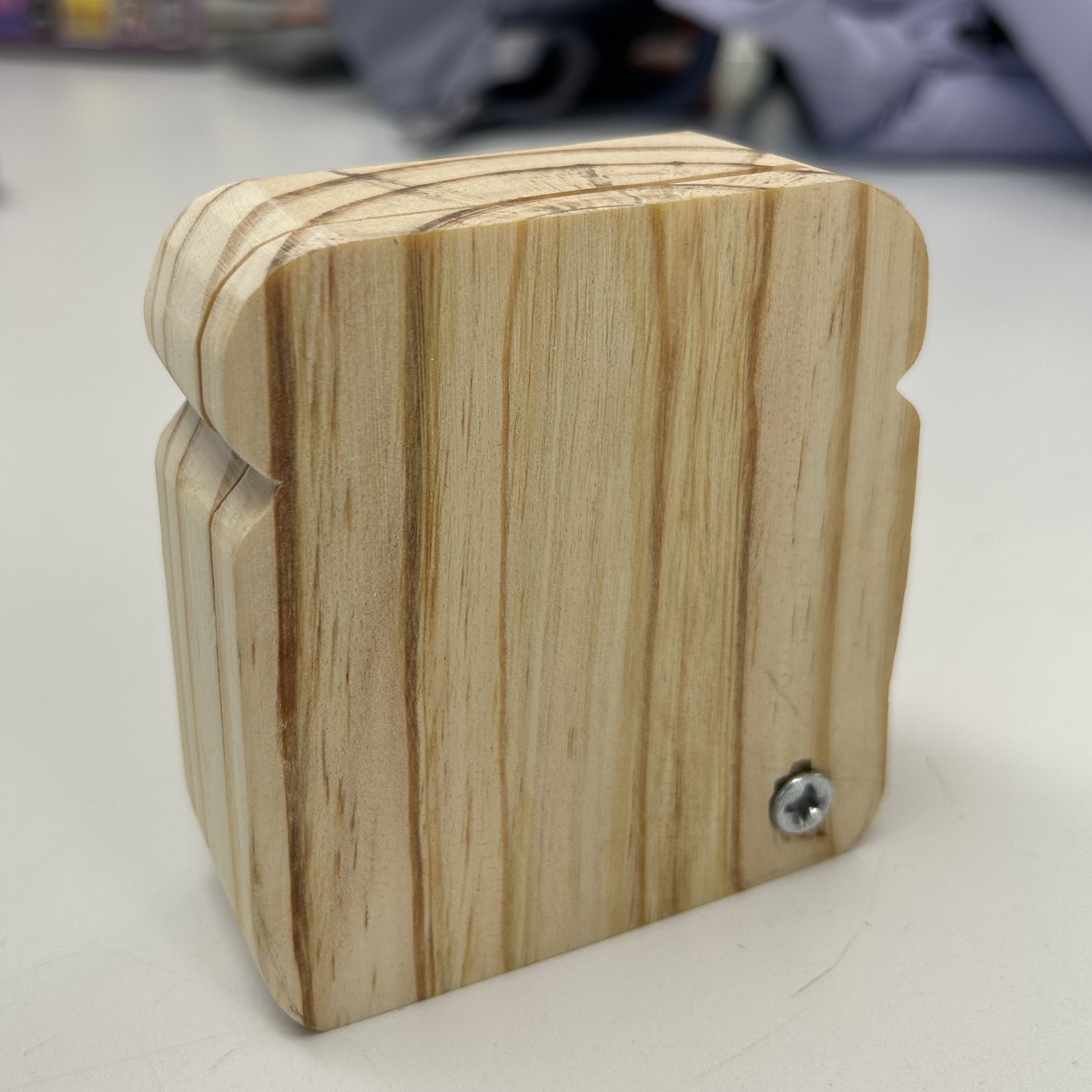 After that, I used the bandsaw to make a little cutout on either side for the top of the bread. It was a little intimidating using the bandsaw for the first time, but because I didn’t need these cuts to be super exact, it went okay. The two pics above are from before and after using sandpaper to round out the edges. It’s starting to look like bread!