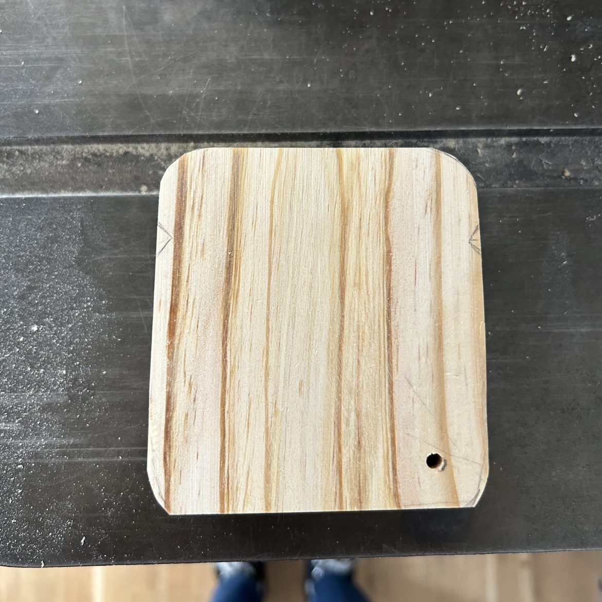 First I cut off a piece from a 2x4 and made sure the angles were good right angles. They weren’t, so I went in and used the sander. Using the mitar saw for the first time was scary. Then I used the drill press to make a hole in the corner for the screw.